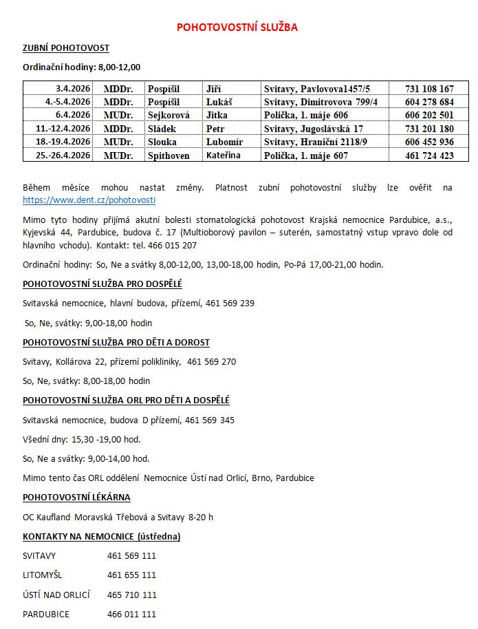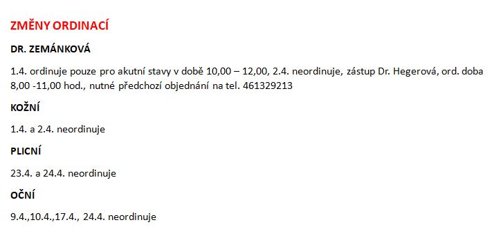 Úvod > Život v obci > Aktuality > Pohotovost, změny ordinační doby - duben 2026