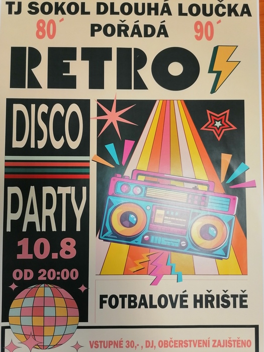 TJ Sokol Dlouhá Loučka pořádá RETRO DISCO PARTY 80 - 90. Akce se koná v sobotu 10. srpna od 20:00 na fotbalovém hřišti v Dlouhé Loučce. Vstupné 30 Kč. Občerstvení zajištěno.