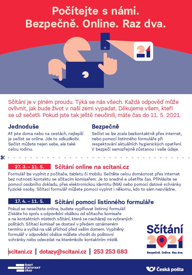 Sčítání 2021 začalo rozhodným okamžikem o půlnoci z 26. na 27. 3. online sčítáním. Z důvodů epidemické situace byla možnost sečíst se online prodloužena do 11. 5. Elektronický sčítací formulář naleznete na webu www.scitani.cz nebo v mobilní aplikaci Sčítání21, která je dostupná v Google Play i App Store. Online formulář můžete jednoduše a bezpečně vyplnit z pohodlí domova i za ostatní členy domácnosti, ať už se jedná o rodinné příslušníky nebo o starší příbuzné.